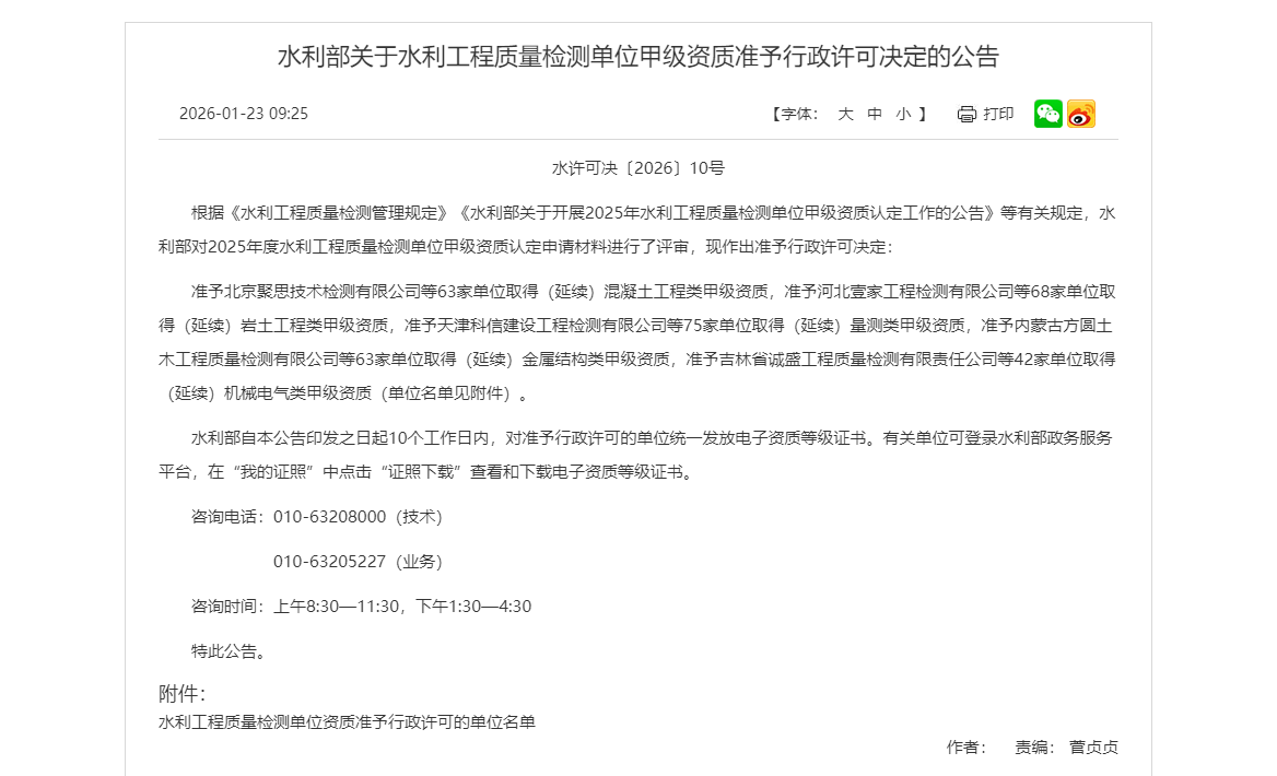 水利部关于水利工程质量检测单位甲级资质准予行政许可决定的公告