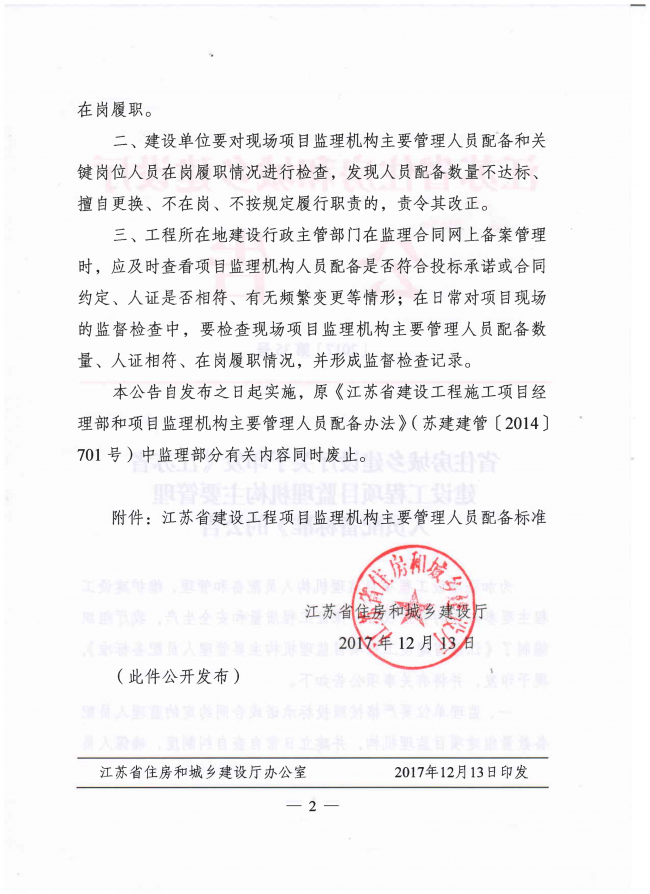 本公告自发布之日起实施,原《江苏省建设工程施工项目经理部和项目监理机构主要管理人员配备办法》(苏建建管〔2014〕701号)中监理部分有关内容同时废止。